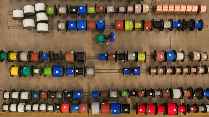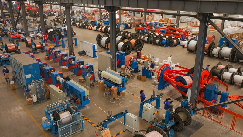 2月20日,工人在四川蓬溪經開區(qū)歐能電纜生產車間內作業(yè)(無人機照片)。