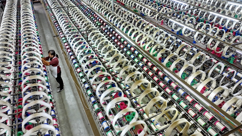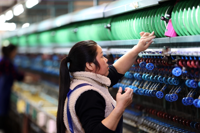 2月21日,在四川省南充市嘉陵工業(yè)集中區(qū),四川順成紡織有限公司的工人在紡織車間內翻絲。