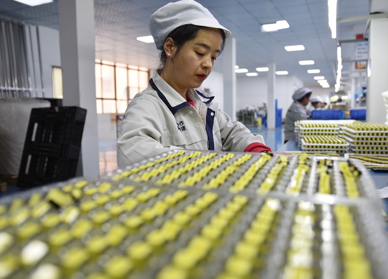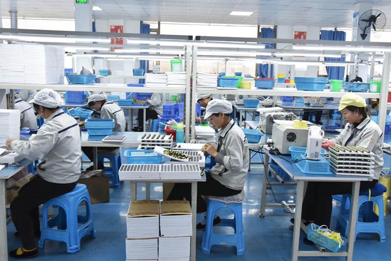 2月20日, 甘肅省臨夏回族自治州康樂縣附城鎮(zhèn)中元村一家電子加工企業(yè)的工人在生產線上工作。