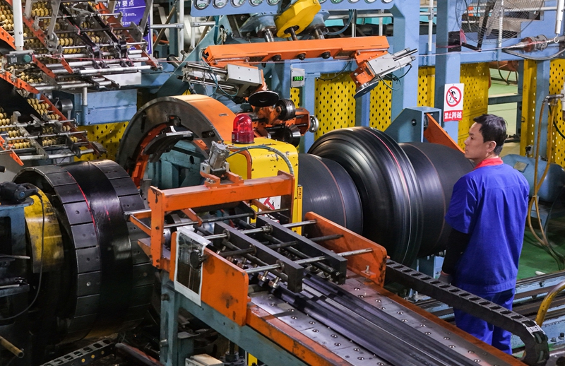 2月21日,在山東省樂陵市經開區(qū)一汽車零部件配套企業(yè),工人在載重子午輪胎生產車間忙碌。
