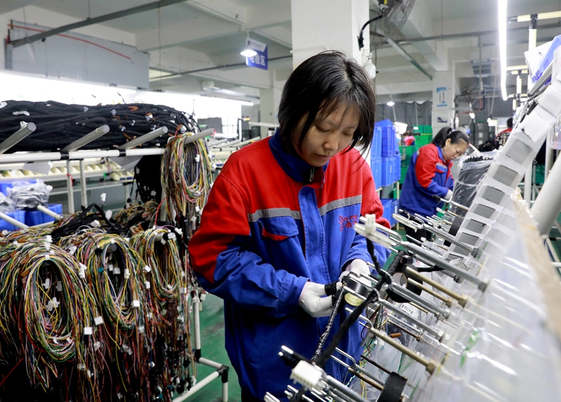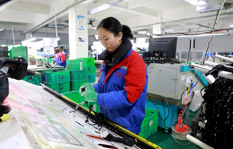 2月21日,四川省華鎣市一家汽車零配件企業(yè)工人在加工汽車線束產品。