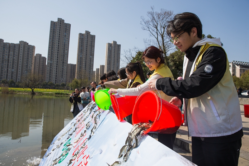 3月21日,在浙江省寧波市北侖區(qū)柴橋街道葦葉公園,志愿者放流魚苗,改善水域生態(tài)環(huán)境。