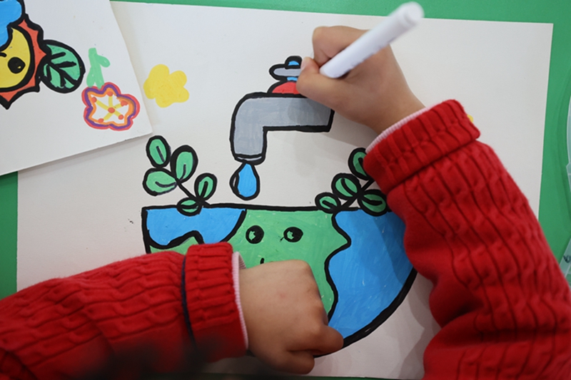 3月21日,河南省開封市新街口幼兒園的小朋友在畫節(jié)水主題圖畫。