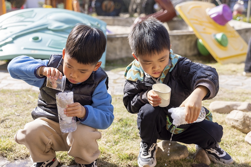 3月21日,浙江省諸暨市城東幼兒園的小朋友在園內的水池邊取水放入自制凈水器。