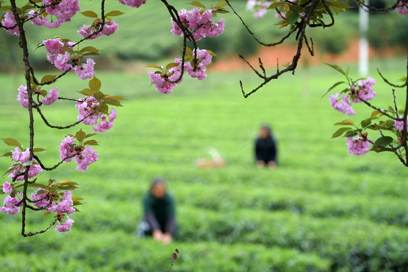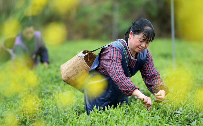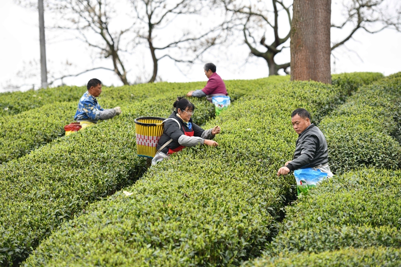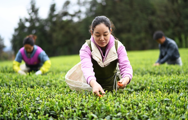 4月6日,村民在鳳岡縣永安鎮(zhèn)田壩社區(qū)茶葉基地采摘春茶。