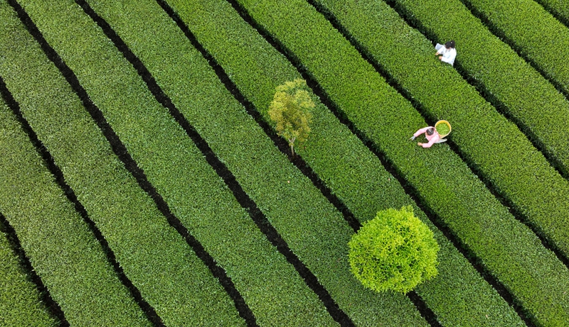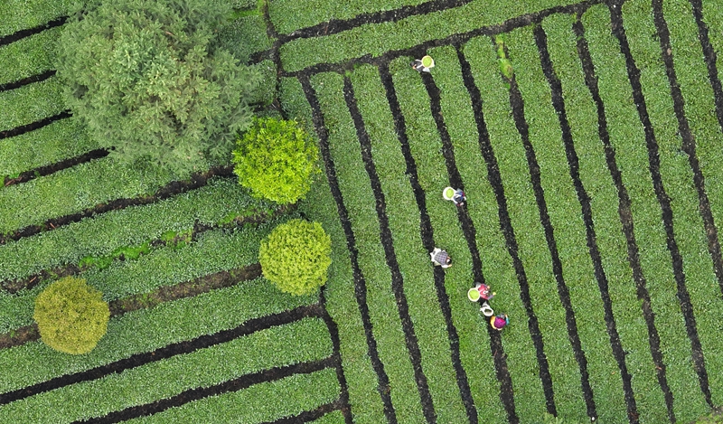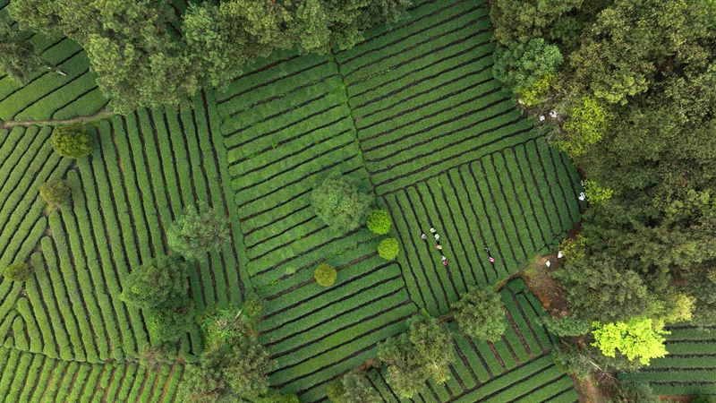 4月6日,村民在鳳岡縣永安鎮(zhèn)田壩社區(qū)茶葉基地采摘春茶(無人機照片)。