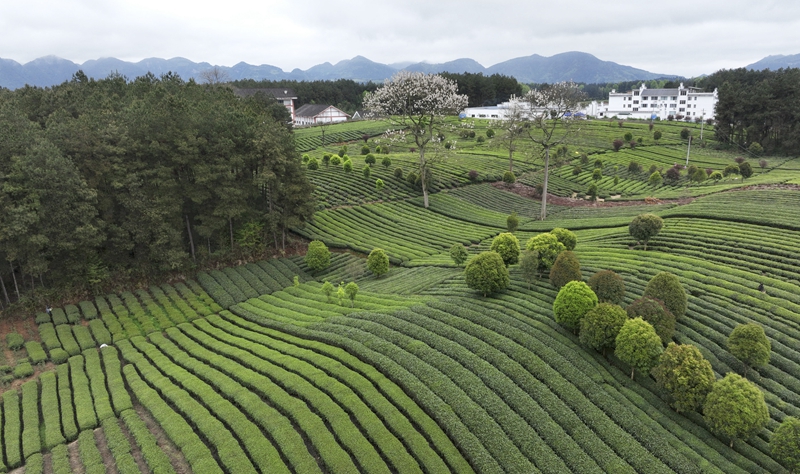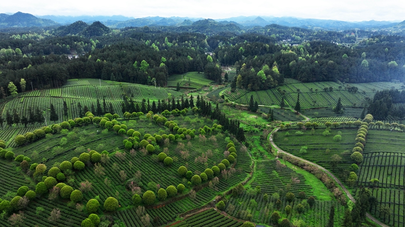 4月6日拍攝的鳳岡縣永安鎮(zhèn)田壩社區(qū)茶葉基地一景(無人機照片)。