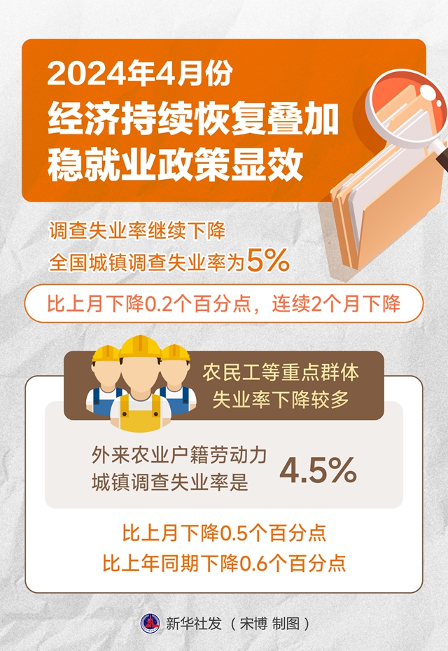 國(guó)家統(tǒng)計(jì)局5月17日發(fā)布的數(shù)據(jù)顯示,4月份,經(jīng)濟(jì)持續(xù)恢復(fù)疊加穩(wěn)就業(yè)政策顯效,調(diào)查失業(yè)率繼續(xù)下降。全國(guó)城鎮(zhèn)調(diào)查失業(yè)率為5%,比上月下降0.2個(gè)百分點(diǎn),連續(xù)2個(gè)月下降。農(nóng)民工等重點(diǎn)群體失業(yè)率下降較多,外來(lái)農(nóng)業(yè)戶籍勞動(dòng)力城鎮(zhèn)調(diào)查失業(yè)率是4.5%,比上月下降0.5個(gè)百分點(diǎn),比上年同期下降0.6個(gè)百分點(diǎn)。