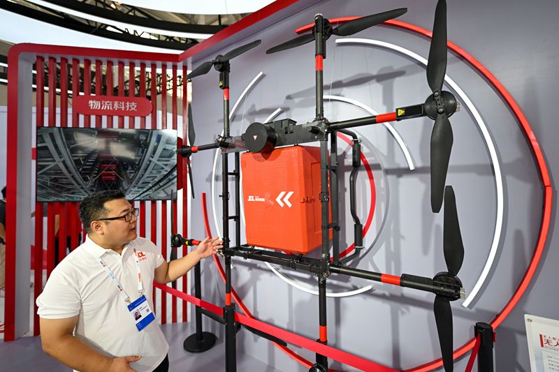 6月20日,參展商在博覽會現(xiàn)場介紹一款專業(yè)物流配送無人機。
