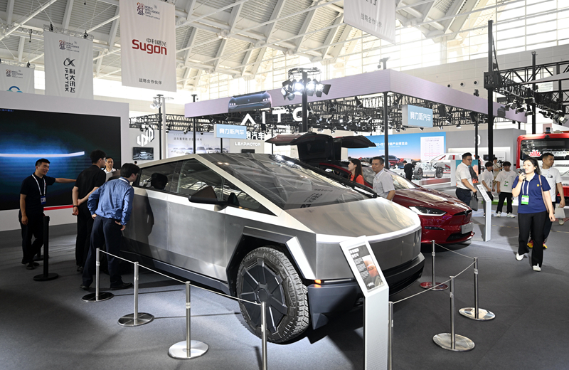 6月20日,參觀者在博覽會智能網(wǎng)聯(lián)汽車展區(qū)參觀特斯拉皮卡車。