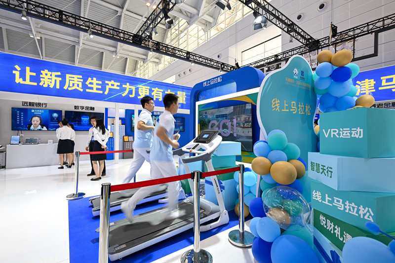 6月20日,人們在博覽會現(xiàn)場體驗線上馬拉松競賽。