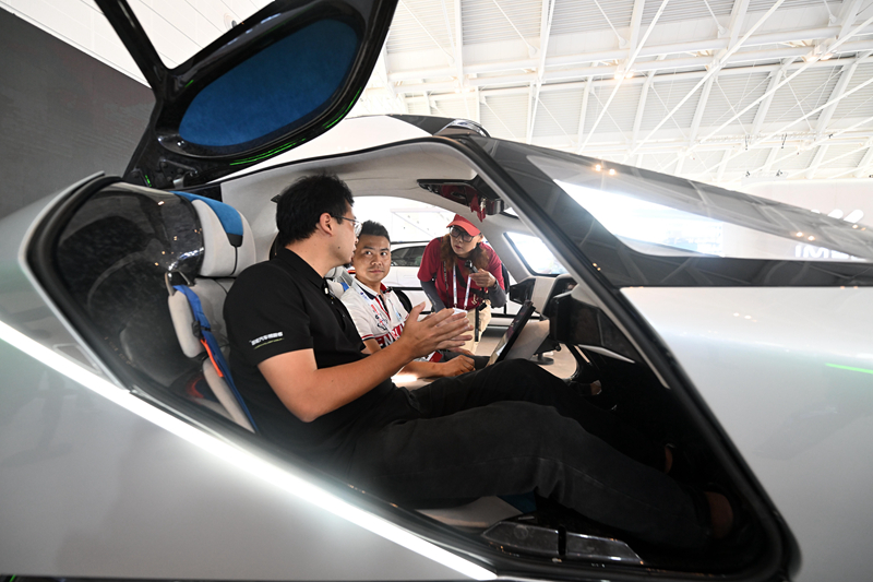 6月20日,參觀者在博覽會智能網(wǎng)聯(lián)汽車展區(qū)小鵬匯天展臺參觀體驗一臺飛行器。