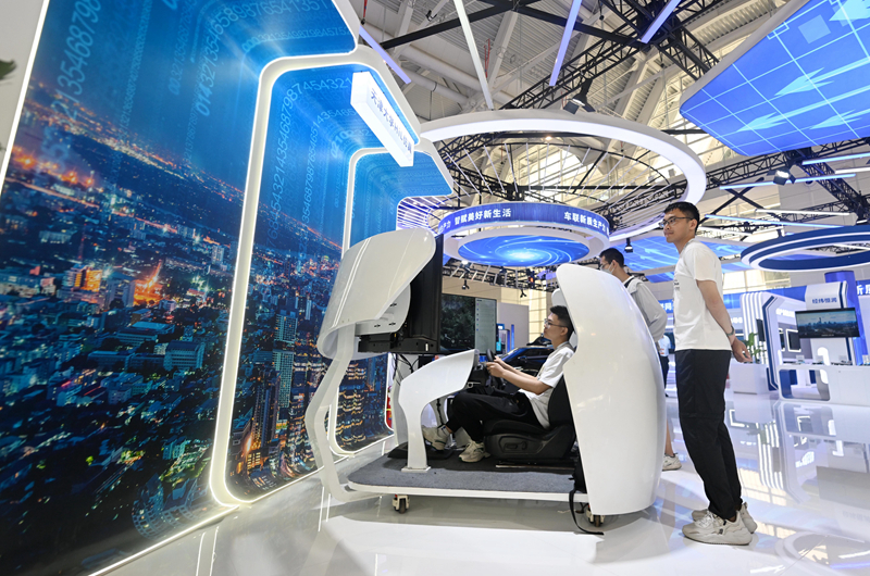 6月20日,參觀者在博覽會智能網(wǎng)聯(lián)汽車展區(qū)進行駕駛體驗。