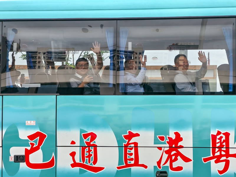 6月30日15時,在首輛進入深中通道中山翠亨東收費站的車輛上,乘客揮手致意。