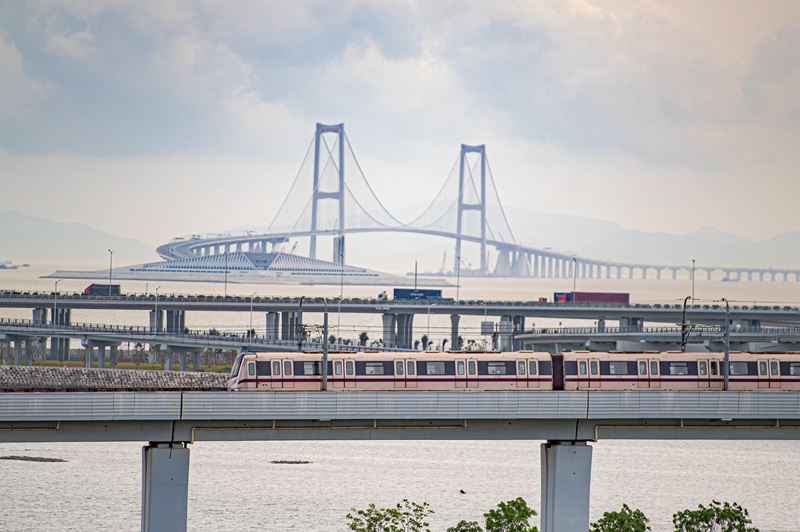 6月19日,深圳地鐵11號線列車和廣深沿江高速上的車輛經過深中通道的深中大橋和西人工島。