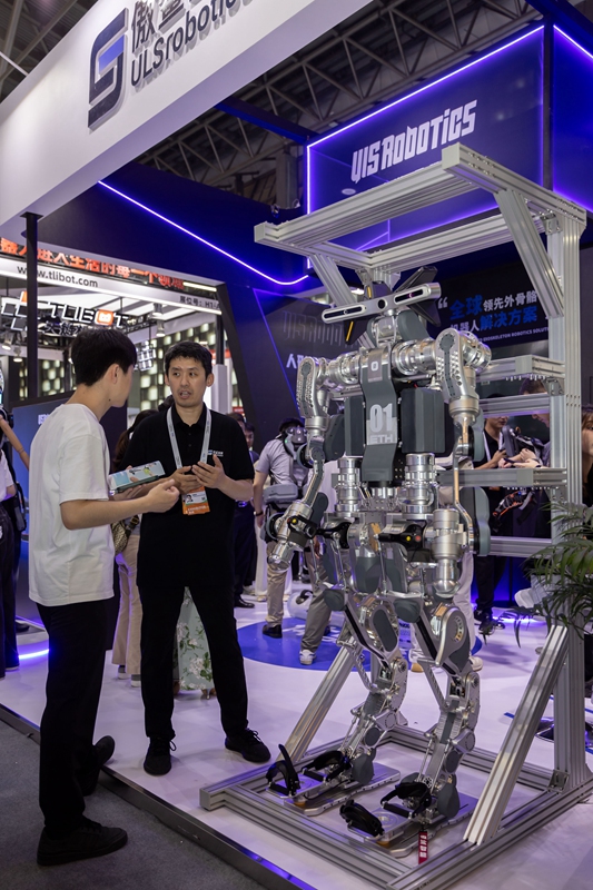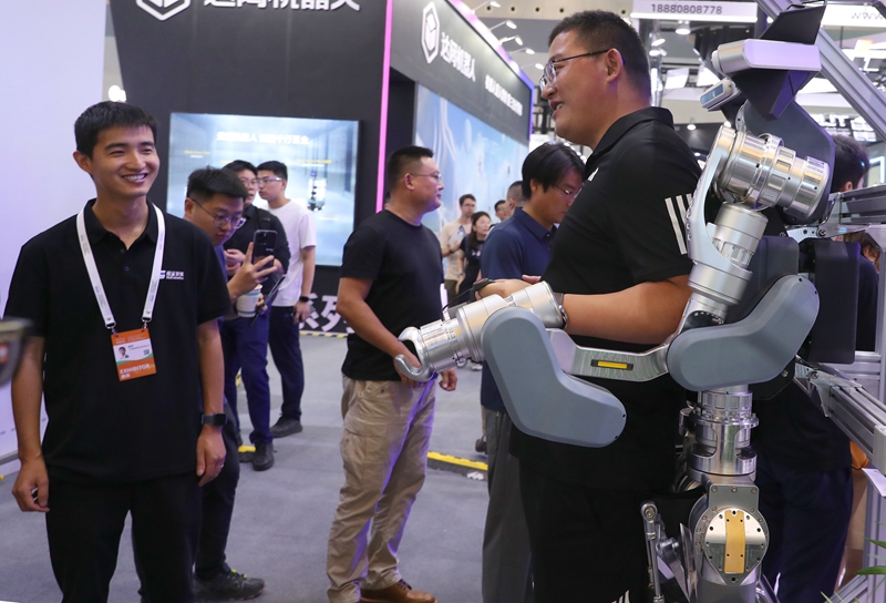 7月4日,參觀者(右)在展會現(xiàn)場體驗一款重型外骨骼設(shè)備。
