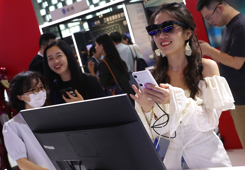 7月4日,參觀者在展臺上體驗一款A(yù)R眼鏡。