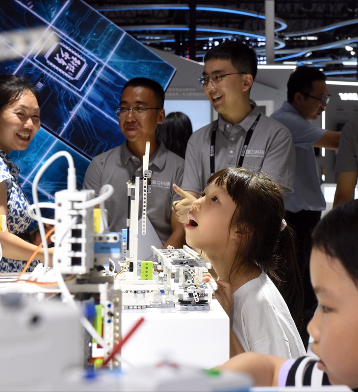 7月4日,在猿力科技展臺,兩名女孩在體驗“編程智能硬件”。
