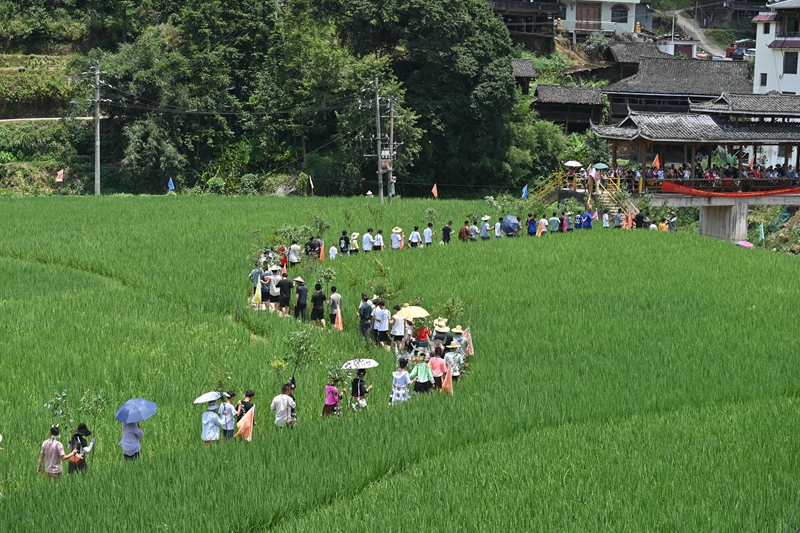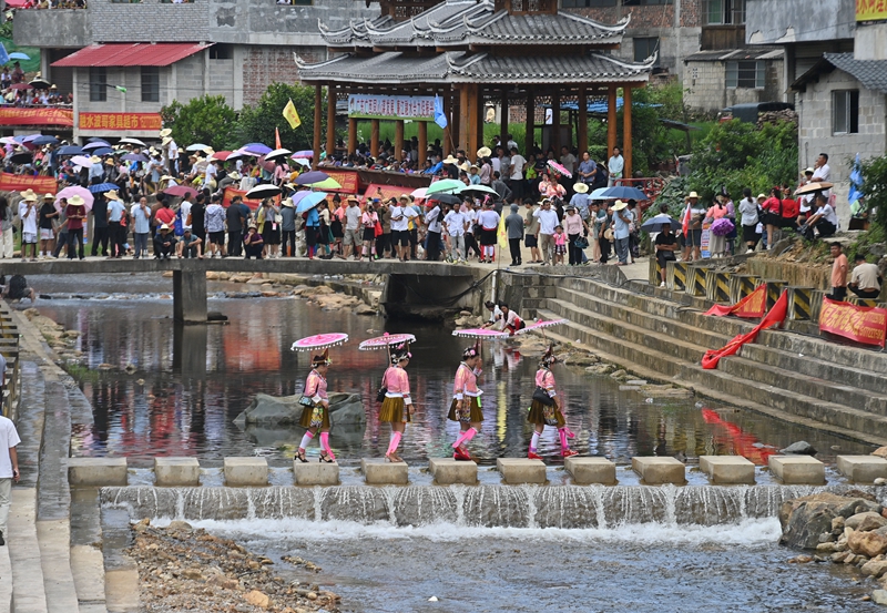 7月21日,在融水苗族自治縣紅水鄉(xiāng)良雙村,村民前去參加鬧魚節(jié)活動(dòng)。今年,良雙村利用粵桂協(xié)作資金,對(duì)河道進(jìn)行了整治和改造,提升旅游基礎(chǔ)設(shè)施條件。