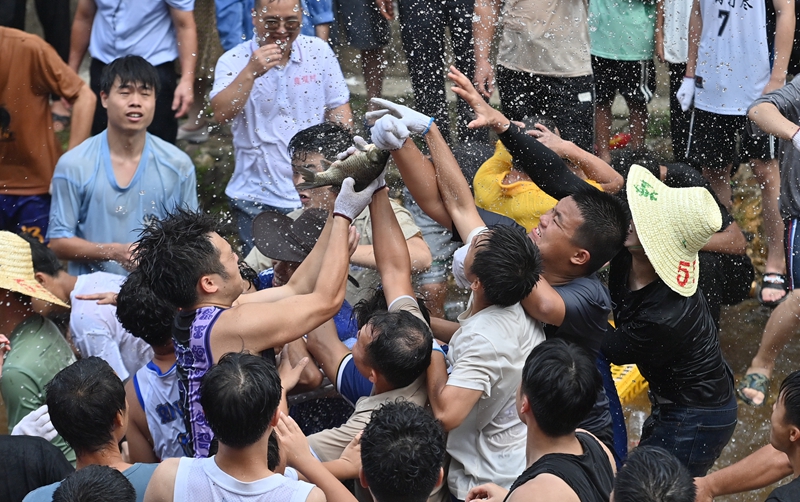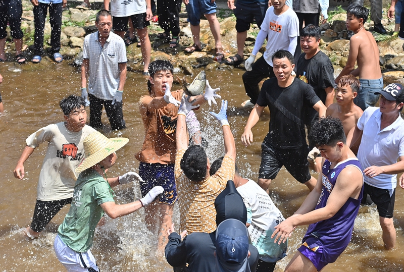 7月21日,在融水苗族自治縣紅水鄉(xiāng)良雙村鬧魚節(jié)活動(dòng)中,村民和游客在河里抓魚。今年,良雙村利用粵桂協(xié)作資金,對(duì)河道進(jìn)行了整治和改造,提升旅游基礎(chǔ)設(shè)施條件。