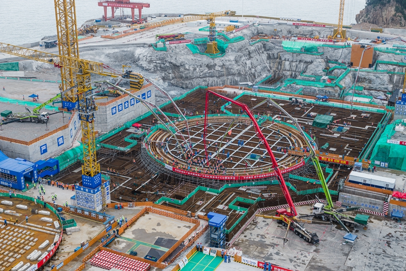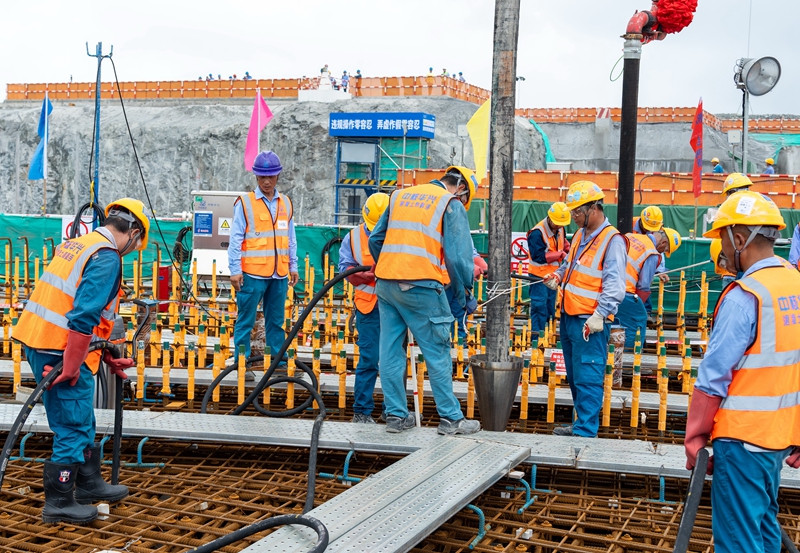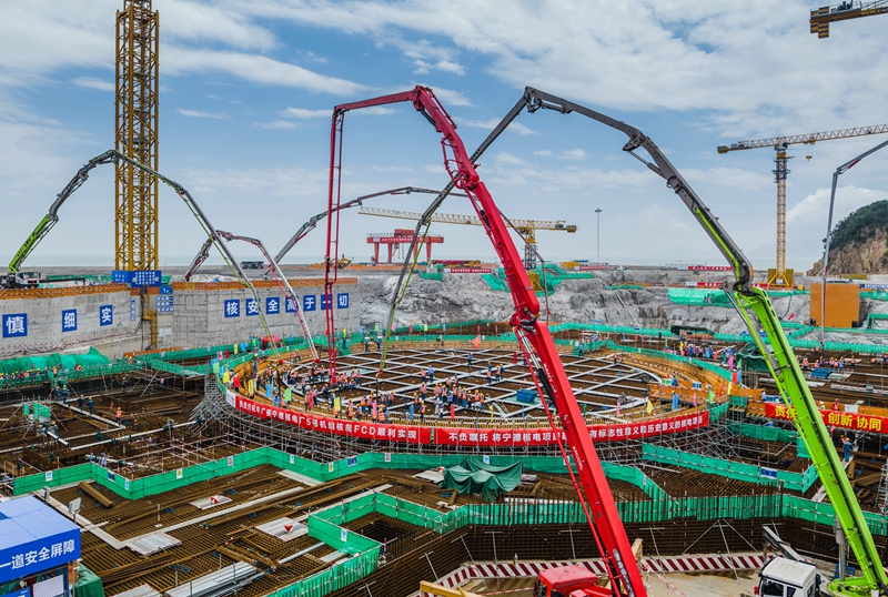 7月28日,施工人員在中廣核寧德核電站5號機(jī)組施工現(xiàn)場澆筑混凝土。