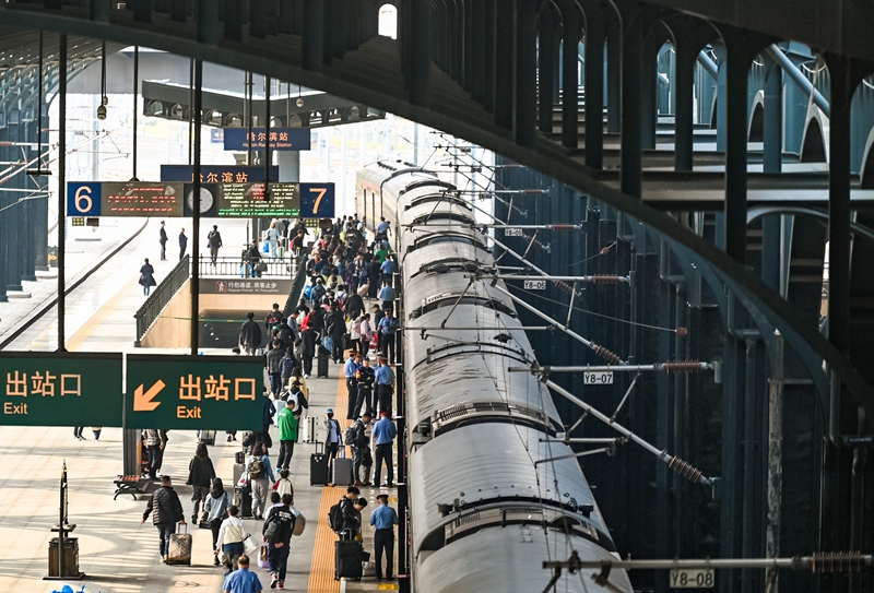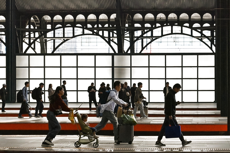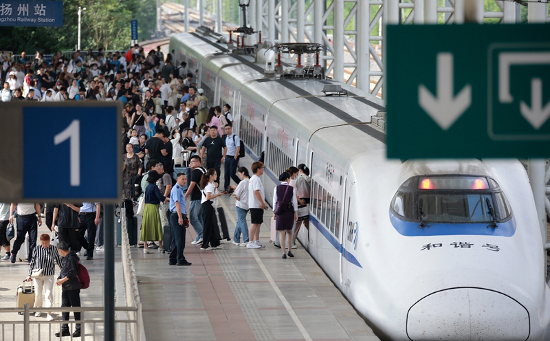 9月29日,旅客在江蘇揚(yáng)州火車站站臺乘車出行。