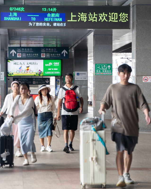 9月29日,人們在上?;疖囌九抨?duì)檢票進(jìn)站。