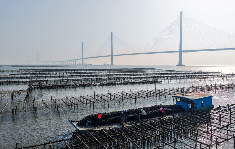 蠔農(nóng)在黃茅海大橋西側(cè)水域收獲國(guó)家農(nóng)產(chǎn)品地理標(biāo)志產(chǎn)品江門臺(tái)山蠔(12月7日攝,無(wú)人機(jī)照片)。