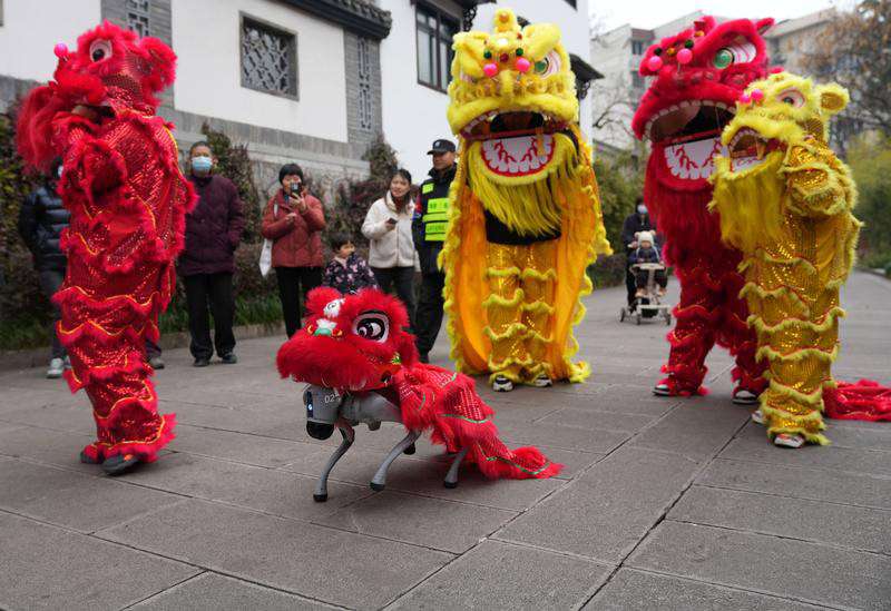2月11日,在浙江杭州市西湖區(qū)北山街道元宵文化廟會(huì)活動(dòng)中,機(jī)器狗與演員一起為社區(qū)居民進(jìn)行舞獅表演。