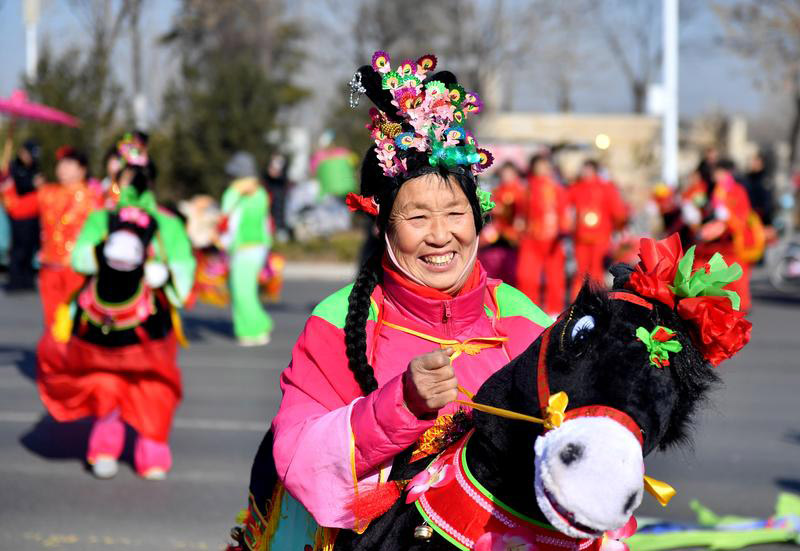 2月9日,河北省石家莊市元氏縣群眾表演“騎毛驢”。