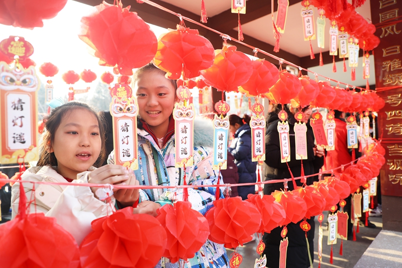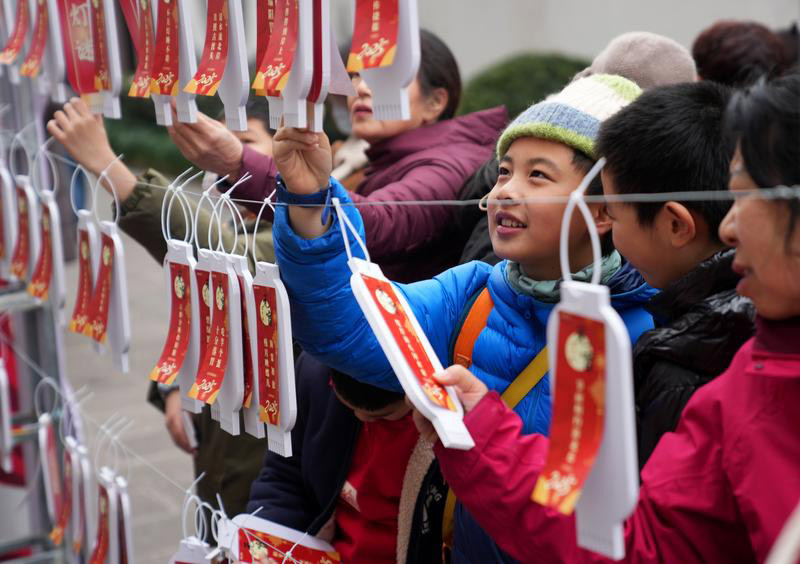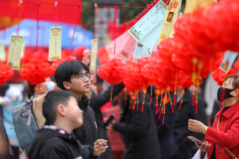 2月11日,在浙江杭州市西湖區(qū)北山街道元宵文化廟會(huì)活動(dòng)中,社區(qū)居民在猜燈謎。