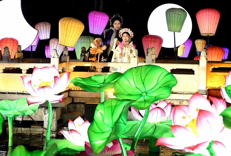 2月8日晚,身著傳統(tǒng)服飾的游人在河北省石家莊市正定榮國(guó)府影視基地內(nèi)游園賞花燈。