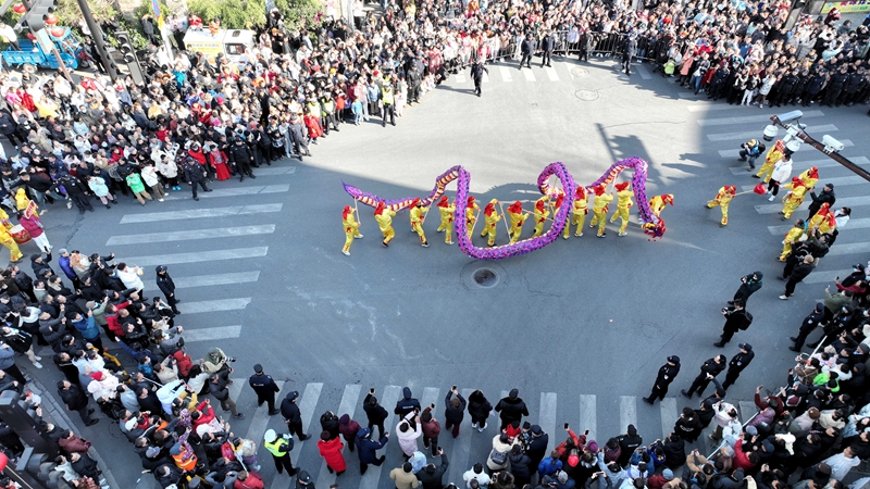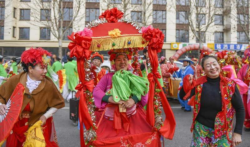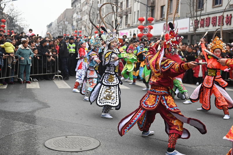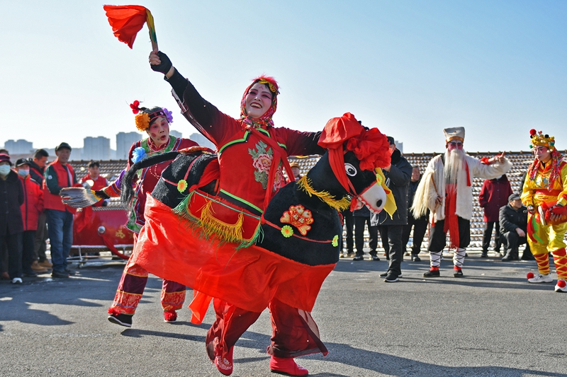 2月11日,民間藝人在河北省遵化市華明路街道表演民俗節(jié)目。