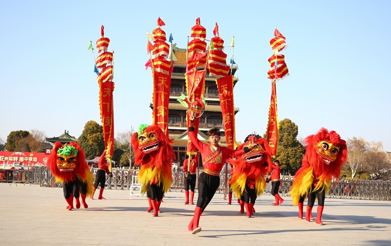 2月9日,民間藝人在山東省棗莊市一景區(qū)表演“中幡舞獅”。