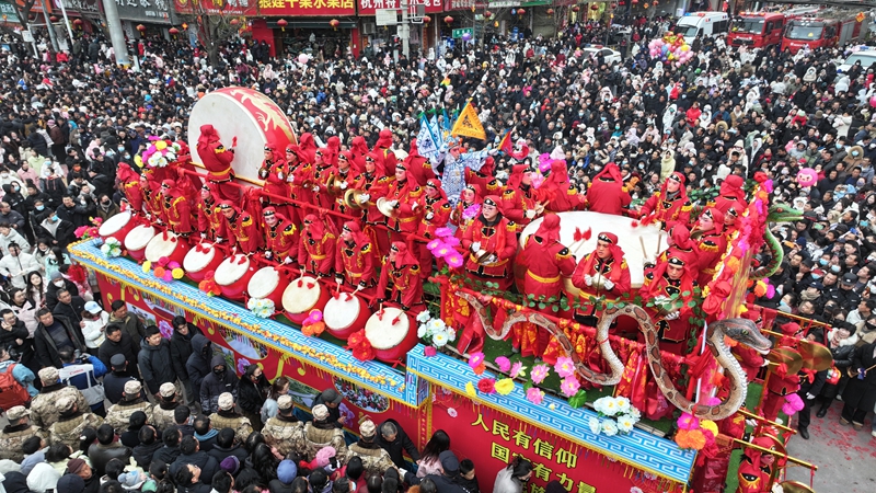 2月9日,在甘肅省平?jīng)鍪星f浪縣“龍騰盛世·歡樂莊浪”第二十一屆民間文化藝術(shù)節(jié)上,群眾觀看巡游的彩車(無人機(jī)照片)。