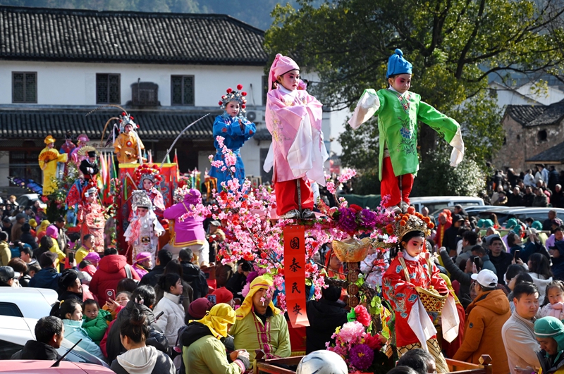 2月10日,浙江省武義縣俞源古村舉行“擎臺(tái)閣”迎元宵大型民俗展演活動(dòng),童男童女扮演的戲曲人物在村中巡游。