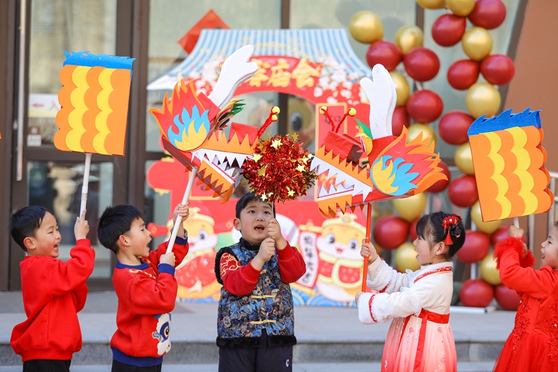 2月10日,小朋友在山東省青島市李滄區(qū)九水東路幼兒園開展的民俗活動(dòng)中進(jìn)行舞龍表演。