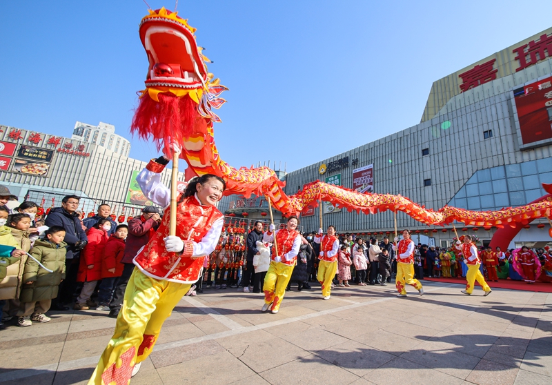 2月9日,民間藝人在山東省煙臺(tái)市芝罘區(qū)東方文化市場(chǎng)表演海陽大秧歌。
