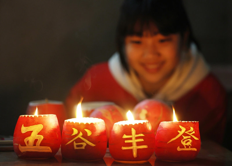 2月10日,山東省臨沂市郯城縣郯城街道新二村一名小女孩觀看點(diǎn)亮的蘿卜燈。