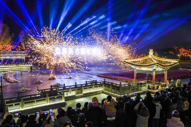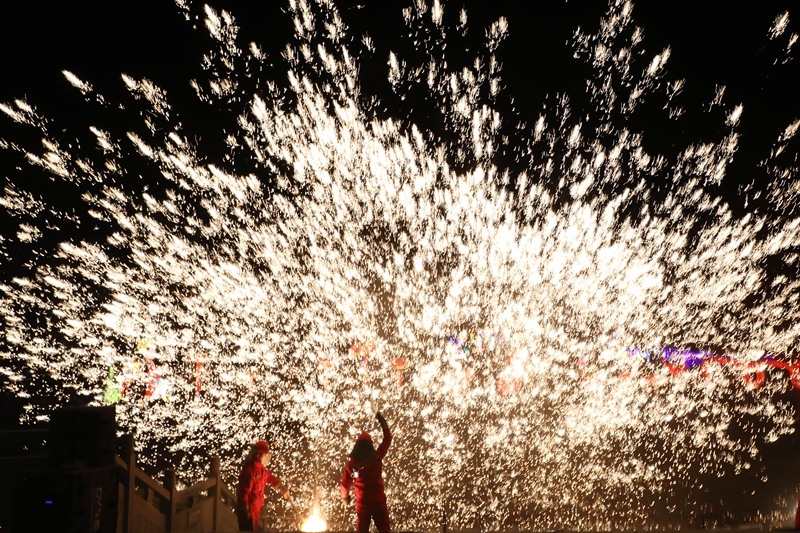 2月10日,游客在河北省秦皇島市山海關(guān)古城景區(qū)觀看打鐵花。