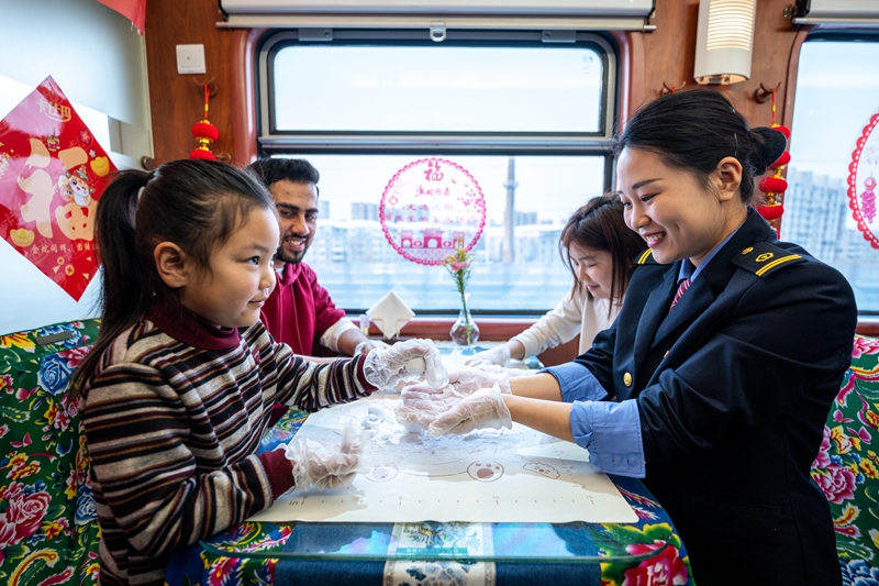 2月11日,沈陽客運(yùn)段客運(yùn)一隊(duì)職工在Z12次列車上和旅客體驗(yàn)制作元宵。