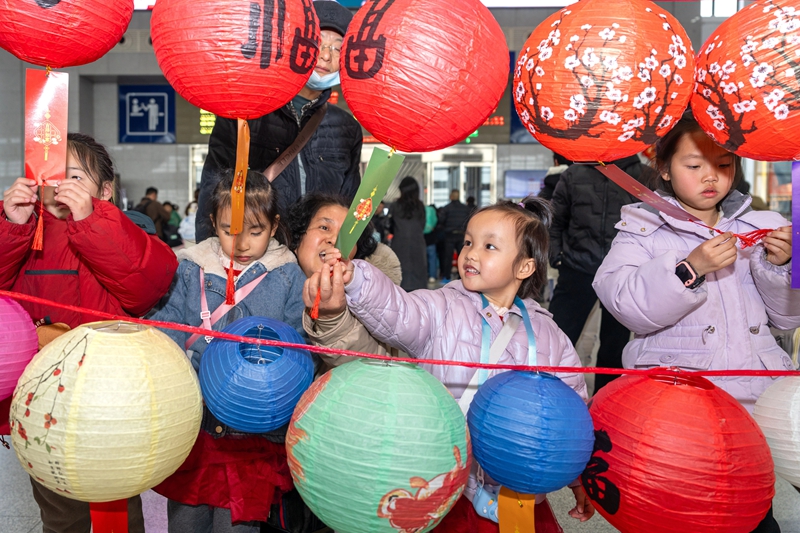 2月11日,旅客在南京南站舉辦的迎接元宵節(jié)活動(dòng)上體驗(yàn)制作花燈。