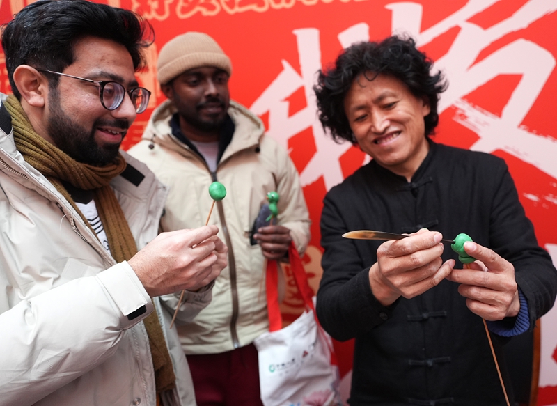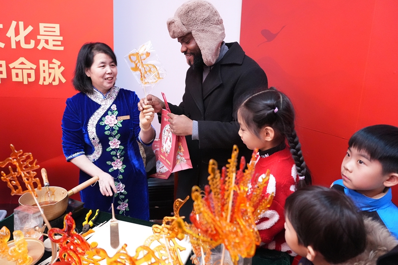 2月11日,在遼寧沈陽馬路灣街道,外國(guó)朋友獲贈(zèng)糖人禮物。