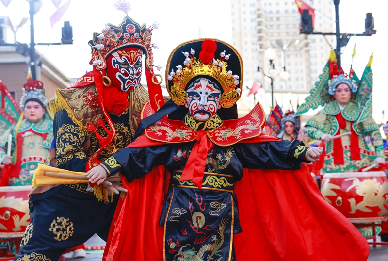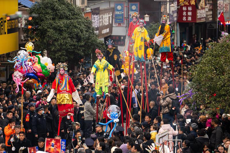 2月11日,演員在烏魯木齊大巴扎步行街舉辦的社火巡游活動(dòng)中表演。