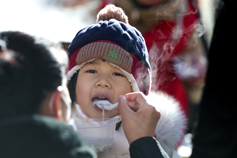 2月11日,在烏魯木齊大巴扎步行街,小朋友在品嘗湯圓。