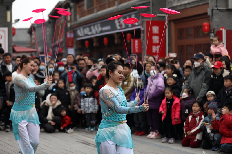 2月11日,在河北省滄州市運(yùn)河區(qū)南川老街景區(qū),民間藝人為游客表演雜技節(jié)目《轉(zhuǎn)花碟》。