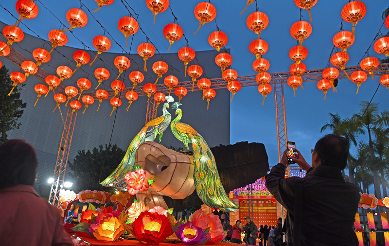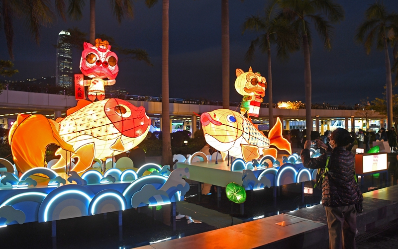 2月11日,人們?cè)谙愀奂馍尘着臄z彩燈。