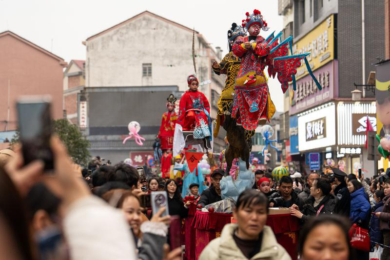 2月11日,在湖南省汨羅市長(zhǎng)樂鎮(zhèn),人們參加抬閣故事會(huì)?!伴L(zhǎng)樂抬閣故事會(huì)”是長(zhǎng)樂鎮(zhèn)當(dāng)?shù)匾豁?xiàng)傳承千年的元宵節(jié)民俗活動(dòng),2011年入選國(guó)家級(jí)非物質(zhì)文化遺產(chǎn)擴(kuò)展項(xiàng)目名錄。