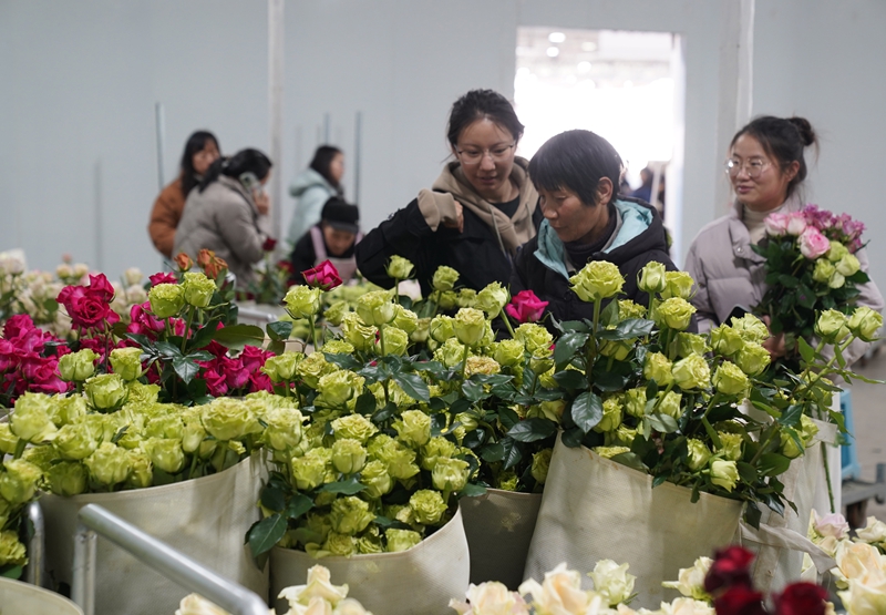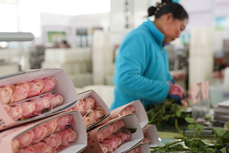 3月24日,工人在麗江現(xiàn)代花卉產(chǎn)業(yè)園包裝鮮花。