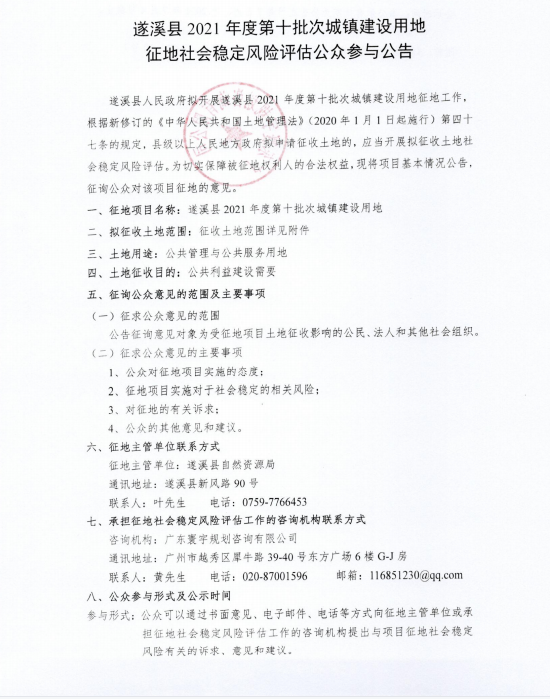 遂溪縣2021年度第十批次城鎮(zhèn)建設(shè)用地征地社會(huì)穩(wěn)定風(fēng)險(xiǎn)評(píng)估公眾參與公告 | | 作者: | 來源:遂溪縣自然資源局 | 時(shí)間:2021-06-28 17:36:59 點(diǎn)擊數(shù):- 附件:遂溪縣人民政府土地征收啟動(dòng)公告遂府告〔2021〕10號(hào).PDF 【打印正文】
